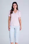 Este é um Pijama produzido em Viscolycra, composto por uma Blusa manga curta na cor preta, com decote V, detalhes em filete contrastante na cor rosa e plaquinha decorativa de metal. Composto também por um Short com estampa poá e elástico na cintura de 2 cm.