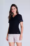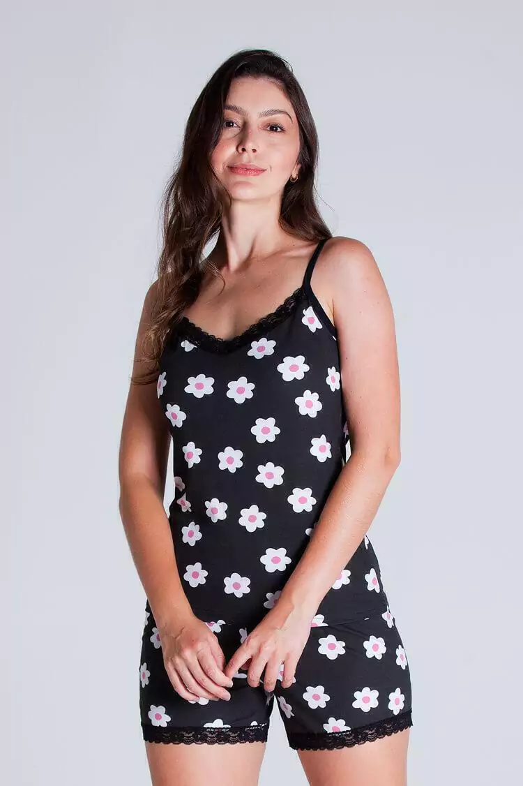 Este é um Pijama produzido em Viscolycra, composto por uma Regata de Alça na cor preta, com estampa de flores e detalhes em renda. Composto também por um Short na cor preta, com estampa de flores, detalhes em renda e elástico de 2cm.