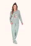 Este é um Pijama produzido em Viscolycra, composto por uma Blusa manga longa na cor verde, com estampa frontal de urso e aplicação de pompom. Composto também por uma Calça com estampa listrada e elástico na cintura de 2cm.