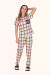Este é um Pijama produzido em Malha, composto por uma Blusa manga curta com estampa xadrez, bolso contrastante com estampa localizada, gola em ribana. Composto também por uma Calça com estampa xadrez e elástico na cintura de 2cm.