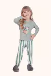 Este é um Pijama produzido em Viscolycra, composto por uma Blusa manga longa na cor verde, com estampa frontal de urso e aplicação de pompom. Composto também por uma Calça com estampa listrada e elástico na cintura de 2cm.