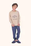 Este é um Pijama produzido em Malha, composto por uma Blusa manga longa na cor bege, com estampa frontal de carro, gola e punho em ribana. Composto também por uma Calça na cor azul mesclado, punho em ribana e elástico na cintura de 2cm.